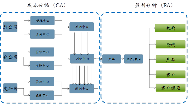 - 盈利分析系統目前各種解決方案可以支撐多級成本分攤業務模式,金融組件中的收入和費用管理解決方案為盈利性分析報表提供成本分攤后明細數據,整合盈利性分析數據源其主要功能如下: